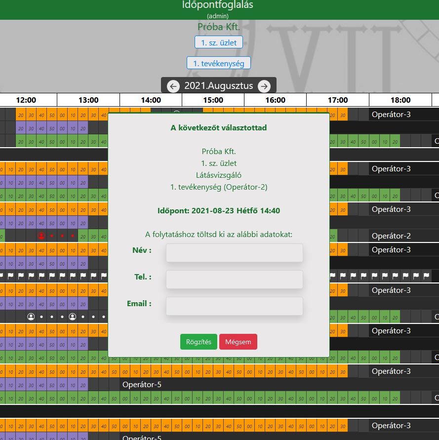 AZ adatok megadása, valamint a Rögzítés után a táblázat újból betöltődik és a választott tevékenység időtartamának megfelő számú jelölés kerül az adott időpont helyére, ezzel is jelezve, hogy sikerült a foglalás.