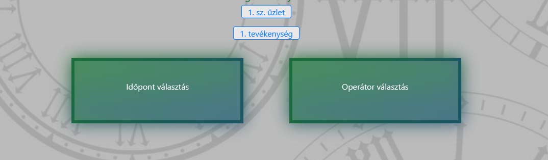 A megfelelő szűrések (üzlet, tevékenység, esetleg operátor) elvégzése után az alábbi táblázathoz hasonló fog megjelenni. Azt, hogy melyik üzlet melyik tevékenységéhez (esetleg melyik operátorához) foglalsz éppen időpontot, a táblázat felett megjelenő gombok feliratán láthatod. Ha változtatni szeretnél ezek bármelyikén, csak rá kell kattintanod, és a kiválasztási folyamat onnan fog újraindulni.