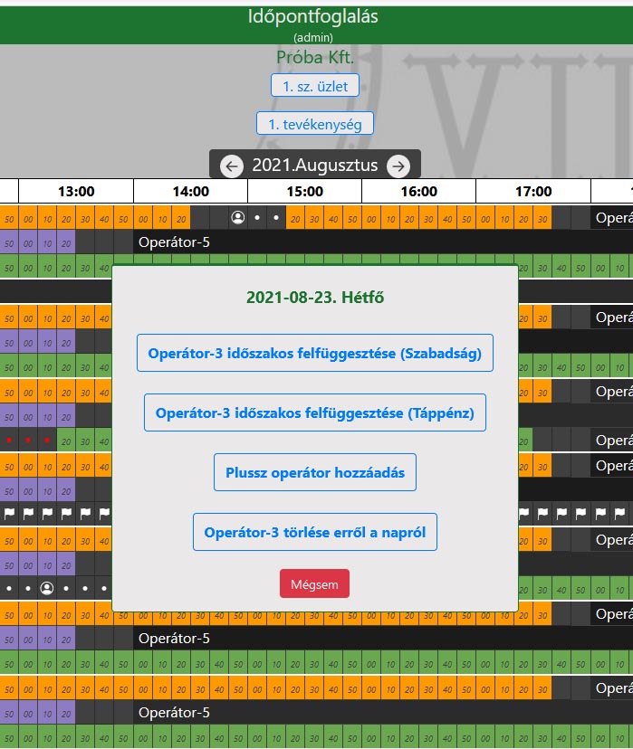 Minden aktív időszakon belüli idővonal elejeén találsz egy jelet az operátor nevét követően. Erre kattintva az alábbihoz hasonló ablak fog megjelenni, ahol különböző műveletek közül tudsz választani. Ezek nem minden esetben azonosak, mert pl. az operátor törlése funkció nem fog megjelenni annál az operátornál akinek már az adott napra van időpontfoglalása. A különböző felfüggesztő beállítások (pl. szabadság, táppénz stb.) is csak akkor jelennek meg, ha a tevékenységek között létre lettek hozva mint felfüggesztő tevékenységek.