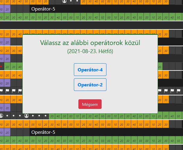 Ez a menűpont csak abban az esetben jelenik meg, ha van olyan operátor a rendszerben, aki jogosult az adott tevékenység végzésére, valamint nincs még hozzárendelve az adott naphoz. Az alábbi ablakhoz hasonlóan lesznek felsorolva az elérhető operátorok.