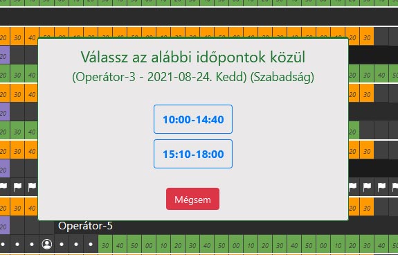 A felfüggesztő menüpontok csak abban az esetben jelennel meg, ha a tevékenységek között létre lettek hozva mint felfüggesztő tevékenységek. Ezt választva megjelennek azok az időintervallumok, amelyekre létre lehet hozni az adott felfüggesztő tevékenységet. Az alábbi ablakban egy olyan eset látható, amikor az adott operátornak az adott napra már van egy időpontfoglalása, ezért vagy az azelőtti vagy az azutáni időszakra lehet csak műveletet végrehajtani.